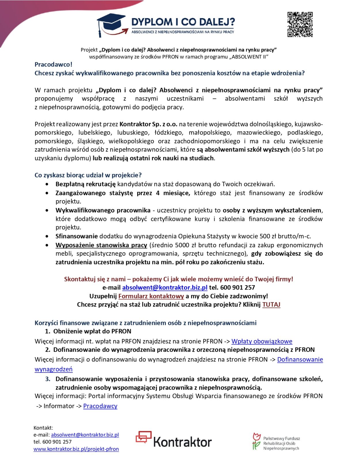 Więcej szczegółów znajdziesz naszej stronie internetowej: www.kontraktor.biz.pl/projekt-pfron i fanpage’u Projektu: https://www.facebook.com/profile.php?id=61575848261328&locale=pl_PL