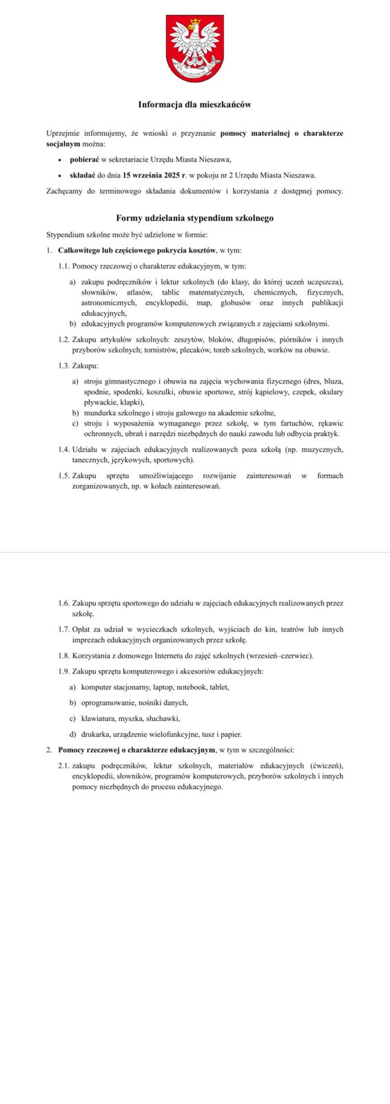 Informacja dla mieszkańców – wniosek o przyznanie pomocy materialnej