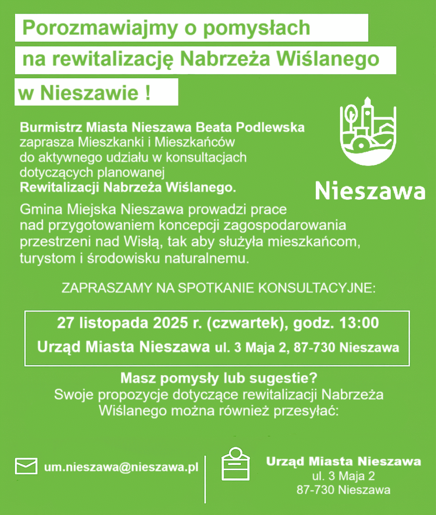Porozmawiajmy o pomysłach na rewitalizację Nabrzeża Wiślanego w Nieszawie! Burmistrz Miasta Nieszawa Beata Podlewska zaprasza Mieszkanki i Mieszkańców do aktywnego udziału w konsultacjach dotyczących planowanej Rewitalizacji Nabrzeża Wiślanego. Gmina Miejska …