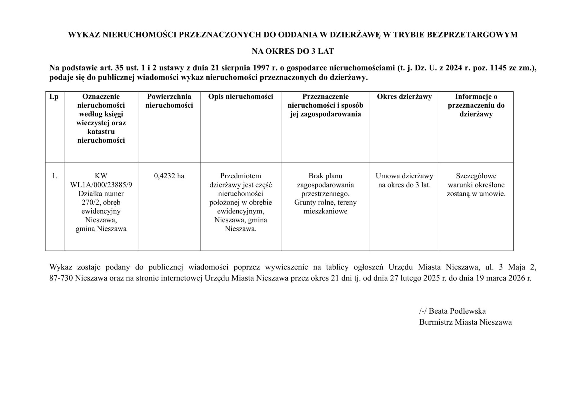 Wykaz nieruchomości przeznaczonych do oddania w dzierżawę w trybie bezprzetargowym na okres do 3 lat