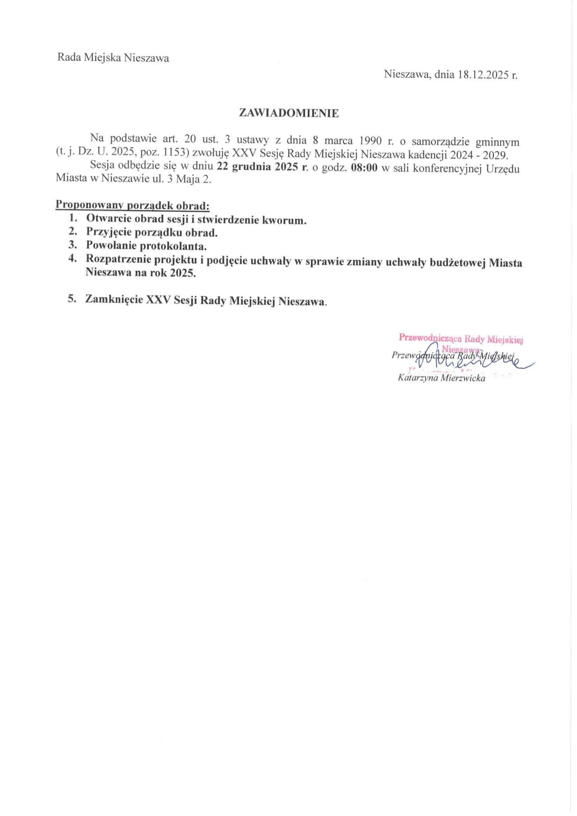 Zawiadomienie dot. Sesji Rady Miejskiej Nieszawa