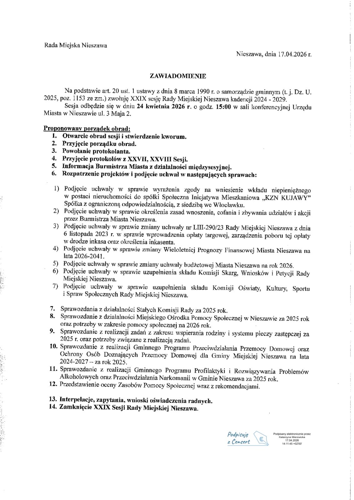 Zawiadomienie dot. Sesji Rady Miejskiej Nieszawa